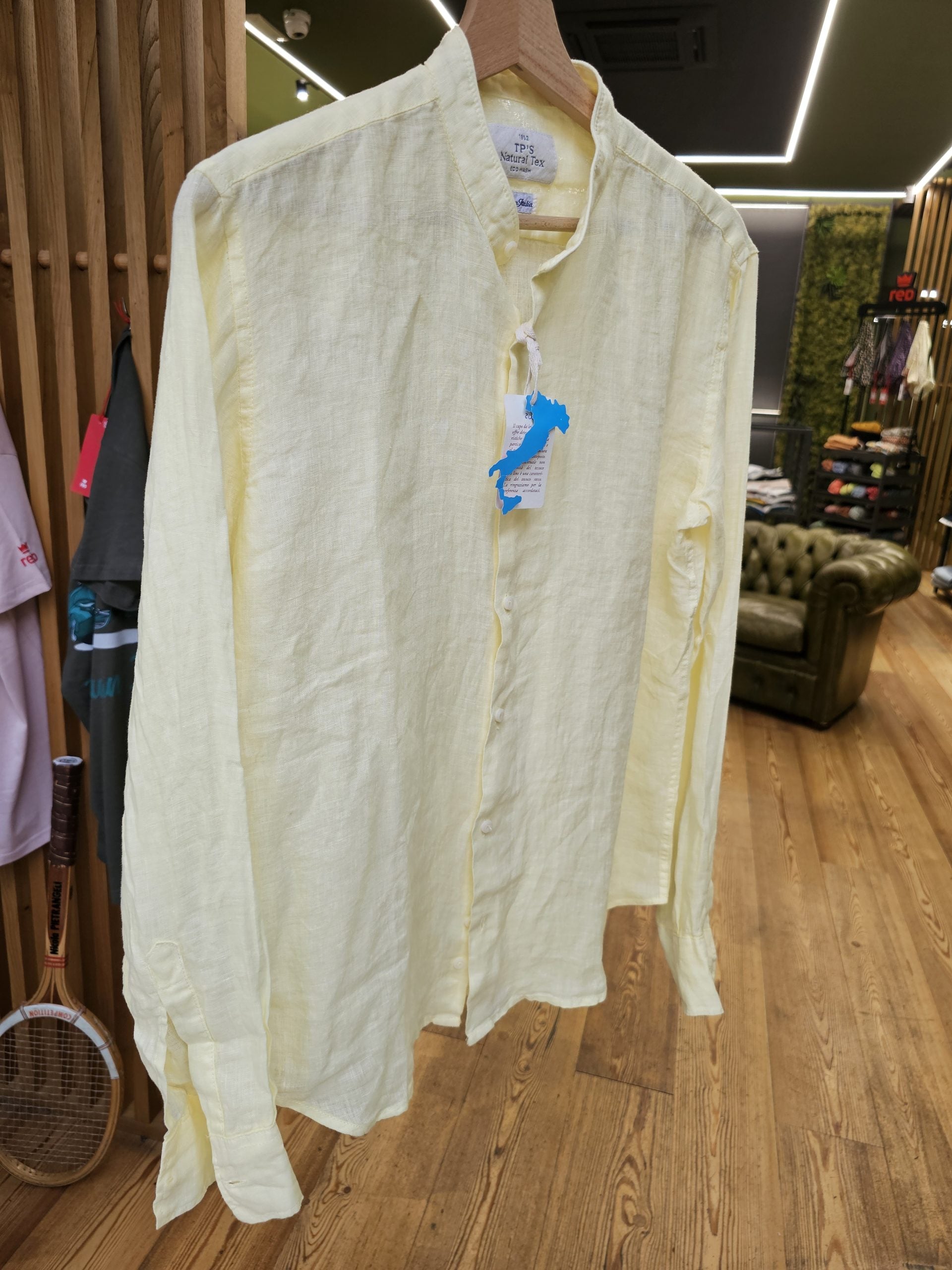 It features a mandarin collar and front buttoning. Long sleeves with double button cuffs and a slim fit.