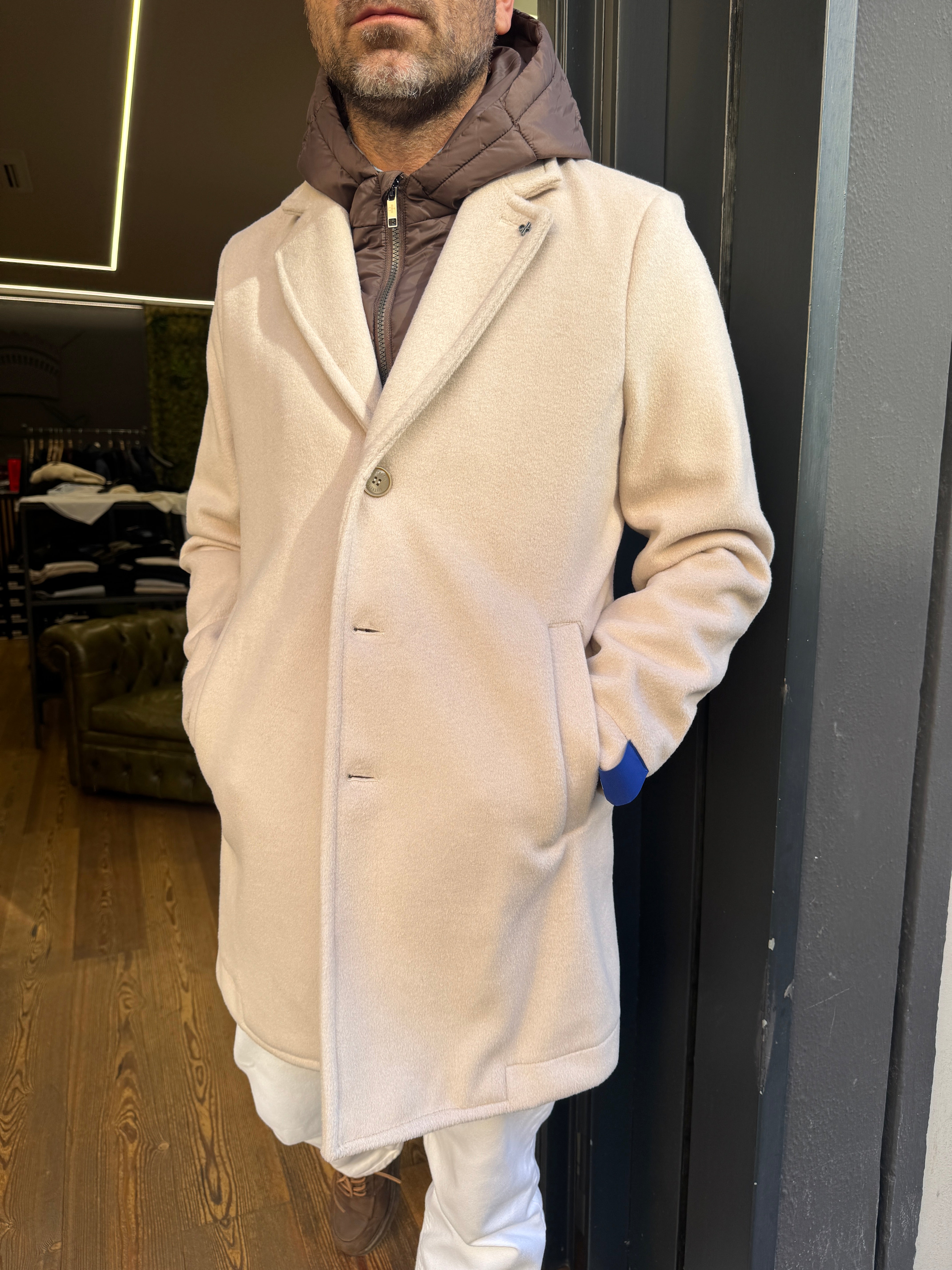 Cappotto in tessuto double misto lana. Il capo presenta un’apertura a 3 bottoni, l’interno corpo completamente sfoderato, una tasca interna a contrasto, 2 bretelle elastiche con logo e un cappuccio con pettorina in nylon imbottito staccabile.