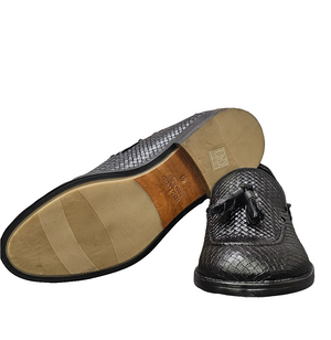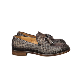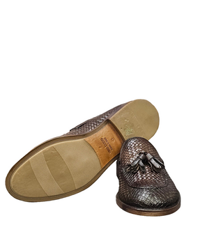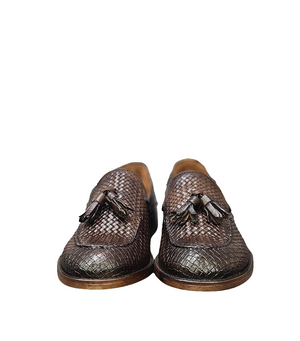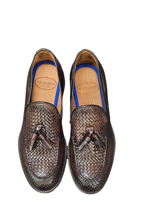Mocassino realizzato nel territorio campano, realizzato artigianalmente con materiali di prima qualità, esclusivamente di origine italiana. Tomaia in pelle, con nappine. Fondo in cuoio , ricoperto in gomma e antiscivoli.