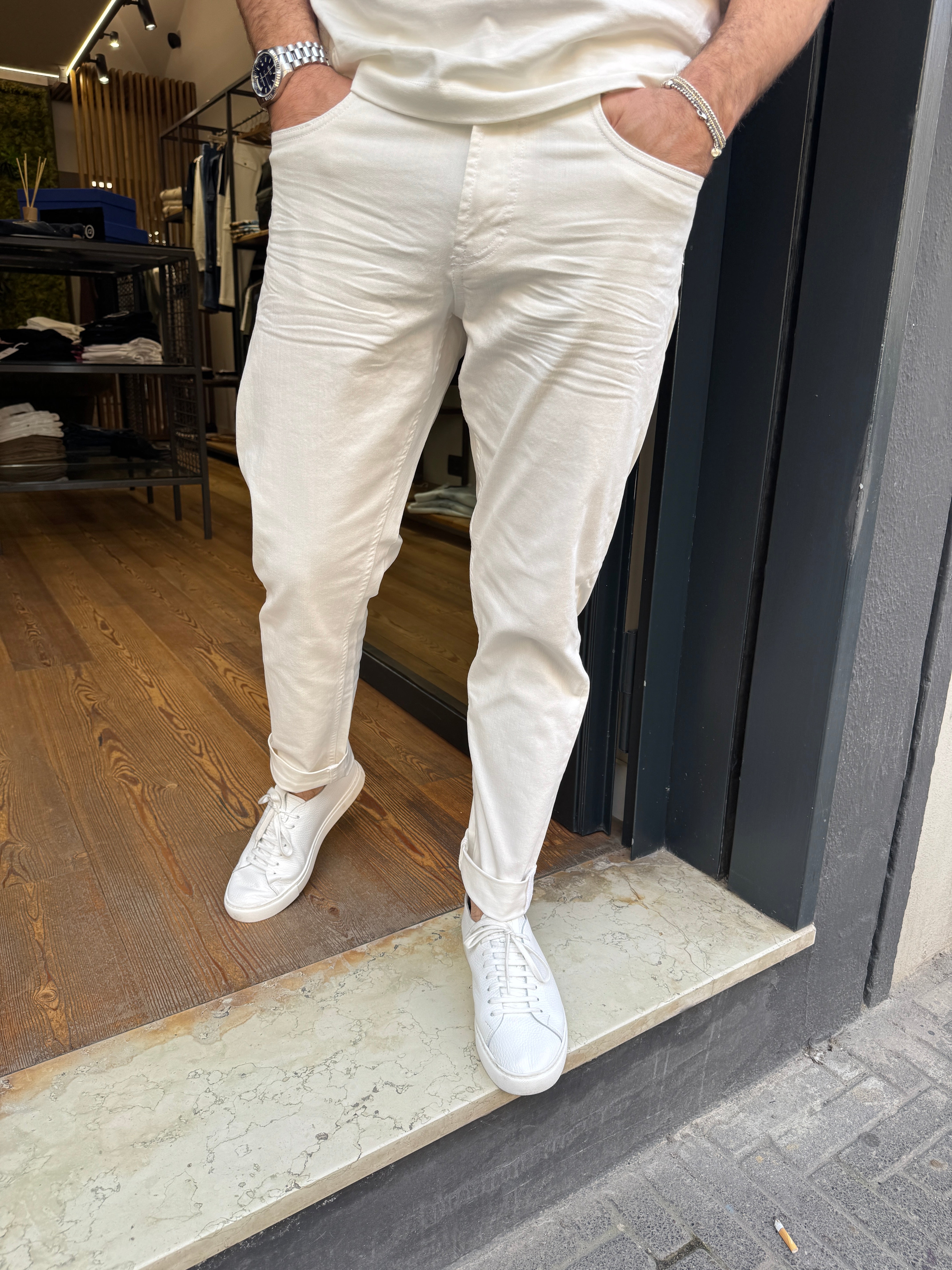 Altezza della vita media e ampiezza del bacino regolare; gamba che accompagna la coscia, senza fasciarla. Il fondo va leggermente a stringere.