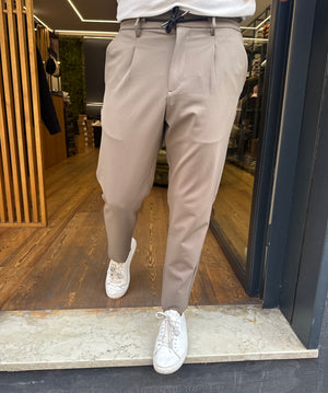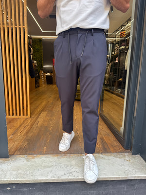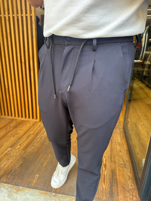 Pantaloni realizzati in tessuto tecnico . Vita elasticizzata regolabile con coulisse. Tasche anteriori e dettaglio di tasche posteriori . Passanti per cintura, chiusura con zip, bottone a ciappa e lacceto a scomparsa, caratterizzato da una pince.