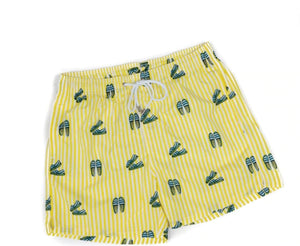 Freschi e leggeri, sono perfetti per le tue giornate al mare o in piscina, si asciugheranno in pochi secondi. Fondo bianco e fantasia con righe gialle espadrillas