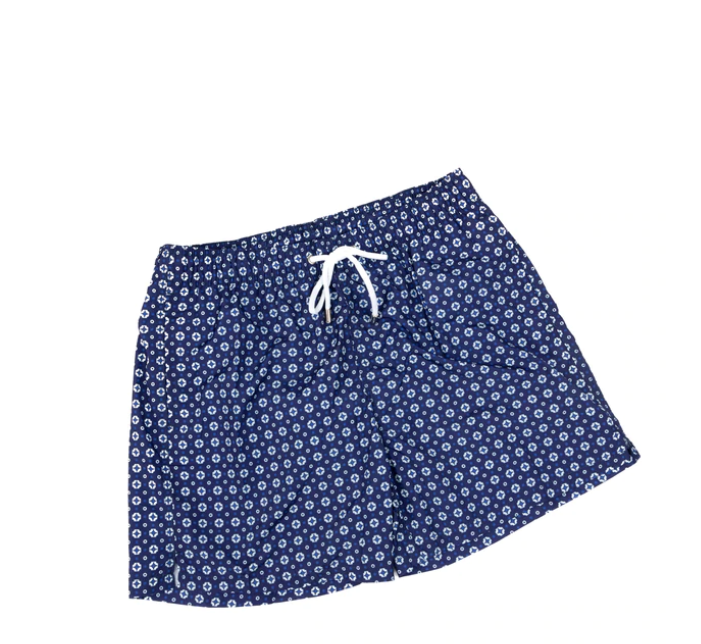 Freschi e leggeri, sono perfetti per le tue giornate al mare o in piscina, si asciugheranno in pochi secondi. Fondo blu e fantasia bianco