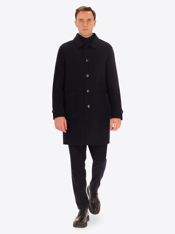 Cappotto in tessuto double misto lana. Il capo presenta un’apertura a 5 bottoni con collo a camicia e tasche a toppa. L’interno corpo completamente sfoderato con una tasca interna a contrasto in punto Milano e 2 bretelle elastiche staccabili con logo. Uno spacco centrale dietro.