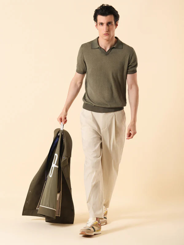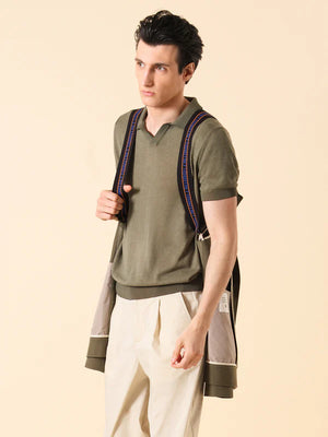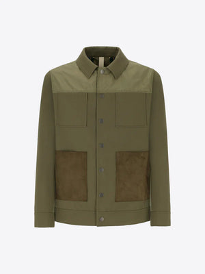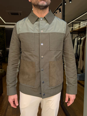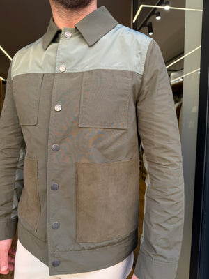 Giubbotto modello aviatore contraddistinto da un mix di tessuti che rappresentano la collezione SS26. Tessuti in cotone tecnico con intarsi in nylon, maglia e pelle vera. Il capo presenta una apertura centrale con bottoni a pressione logati, tasche alte a toppa con pattina e basse a toppa in pelle vera, collo a vela, polsi a camicia. All’interno oltre due tasche in contrasto, una stampa nella schiena del logo presenta le iconiche bretelle elastiche con il nome del brand.