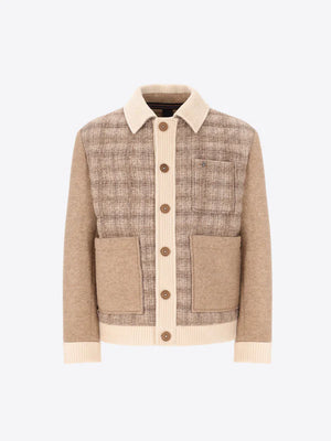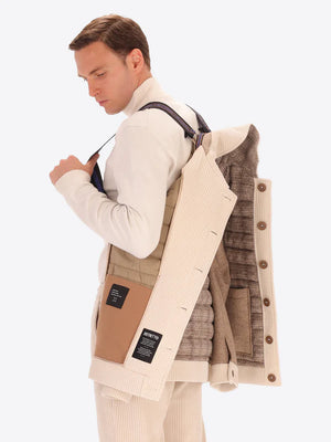 Giubbotto modello aviatore contraddistinto da un mix di tessuti che rappresentano la collezione FW26. Tessuti in lana cotta accoppiati con ovatta termica e nylon trapuntati, lana cotta con neoprene e velluto rocciatore sempre accoppiato con jersey di viscosa e neoprene. Il capo presenta una apertura centrale con asole e bottoni, tasche a filetto e un taschino a toppa sul petto, collo a vela, polsi a camicia; sfoderato all’interno nelle maniche e presenta le iconiche bretelle elastiche con logo.