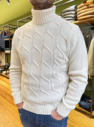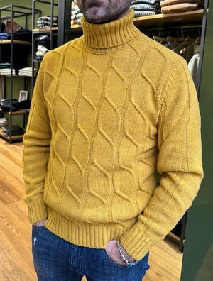 Morbido e caldo maglione dolcevita, impreziosito da una trama a trecce larghe che gli regala un gusto classico ed uno stile casual in base alla necessità. Il modello è alto 1.77cm e indossa una L.
