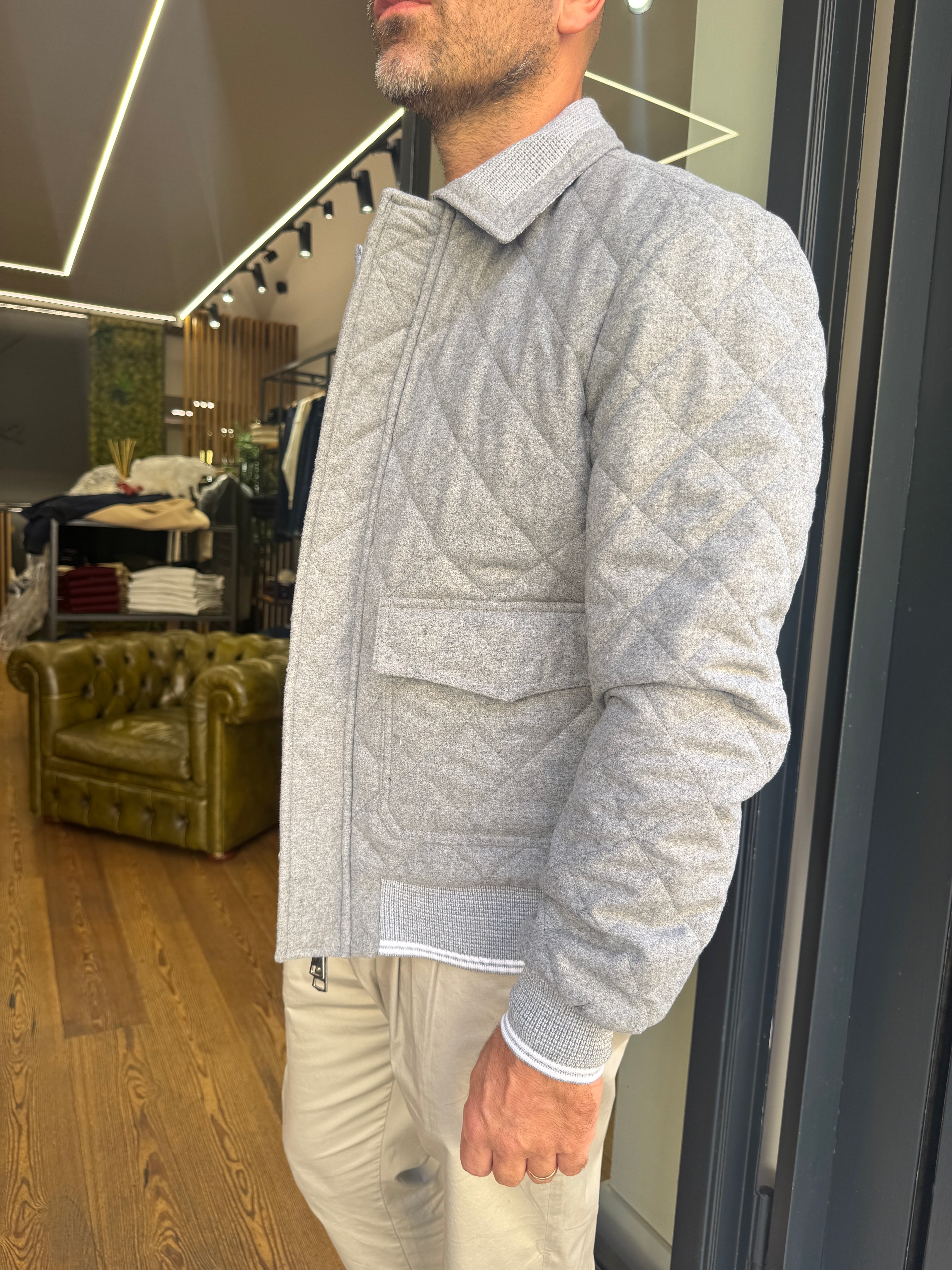 Tap modello bomber, con colletto , bordo in maglia a costine. Grandi tasche a toppa con patta . Chiusura con zip con doppio cursore e bottoni a pressione. Realizzato in una fodera all'interno a fantasia, mentre esternamente e caratterizzato da quadretti.