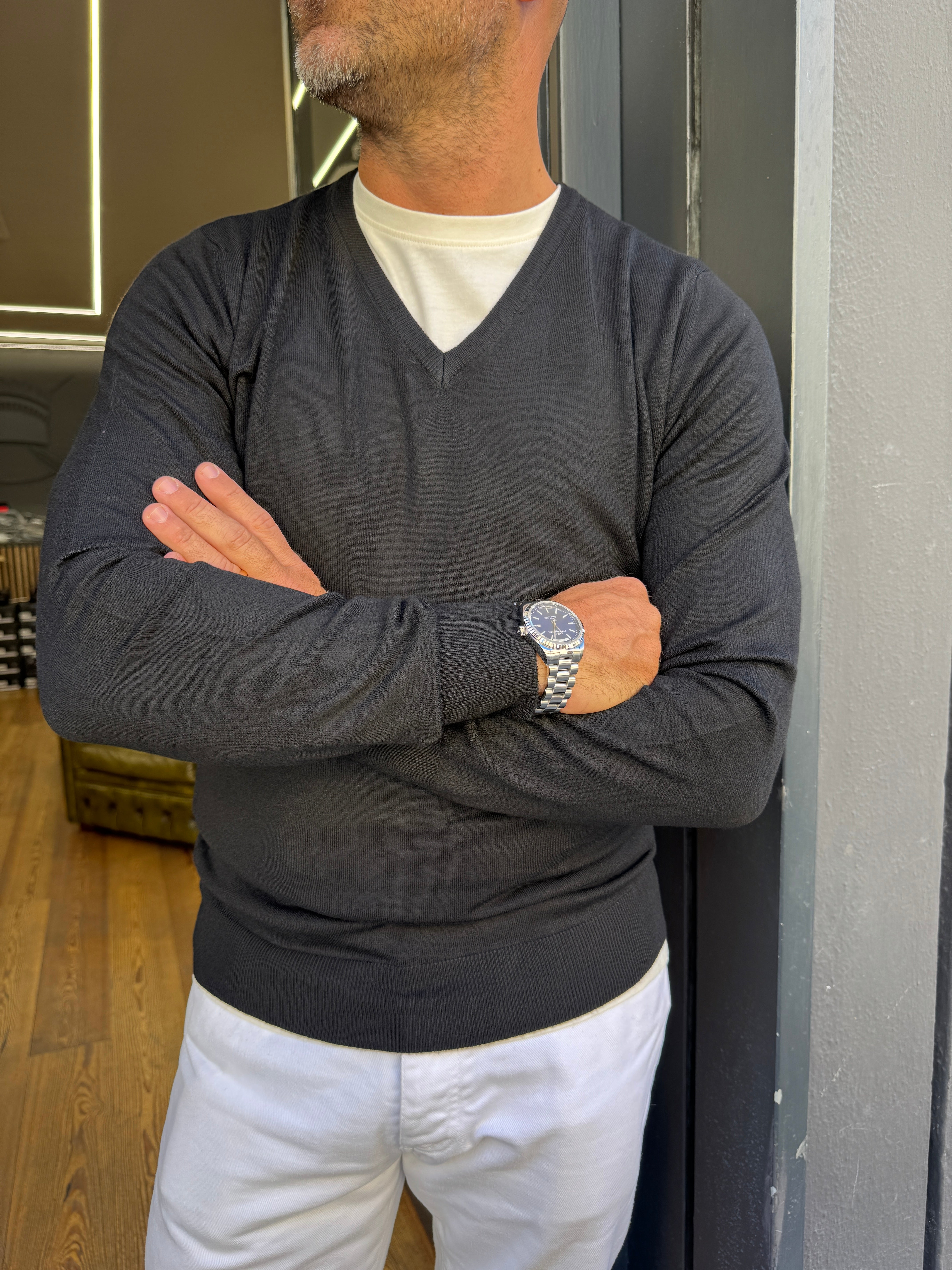 Esclusivo scollo a V , prezioso da non poter mancare nel guardaroba maschile. Caldo, leggero e dalla morbidezza impalpabile, dedicato ai clienti che apprezzano un filato unico. Ideale come sottogiacca.