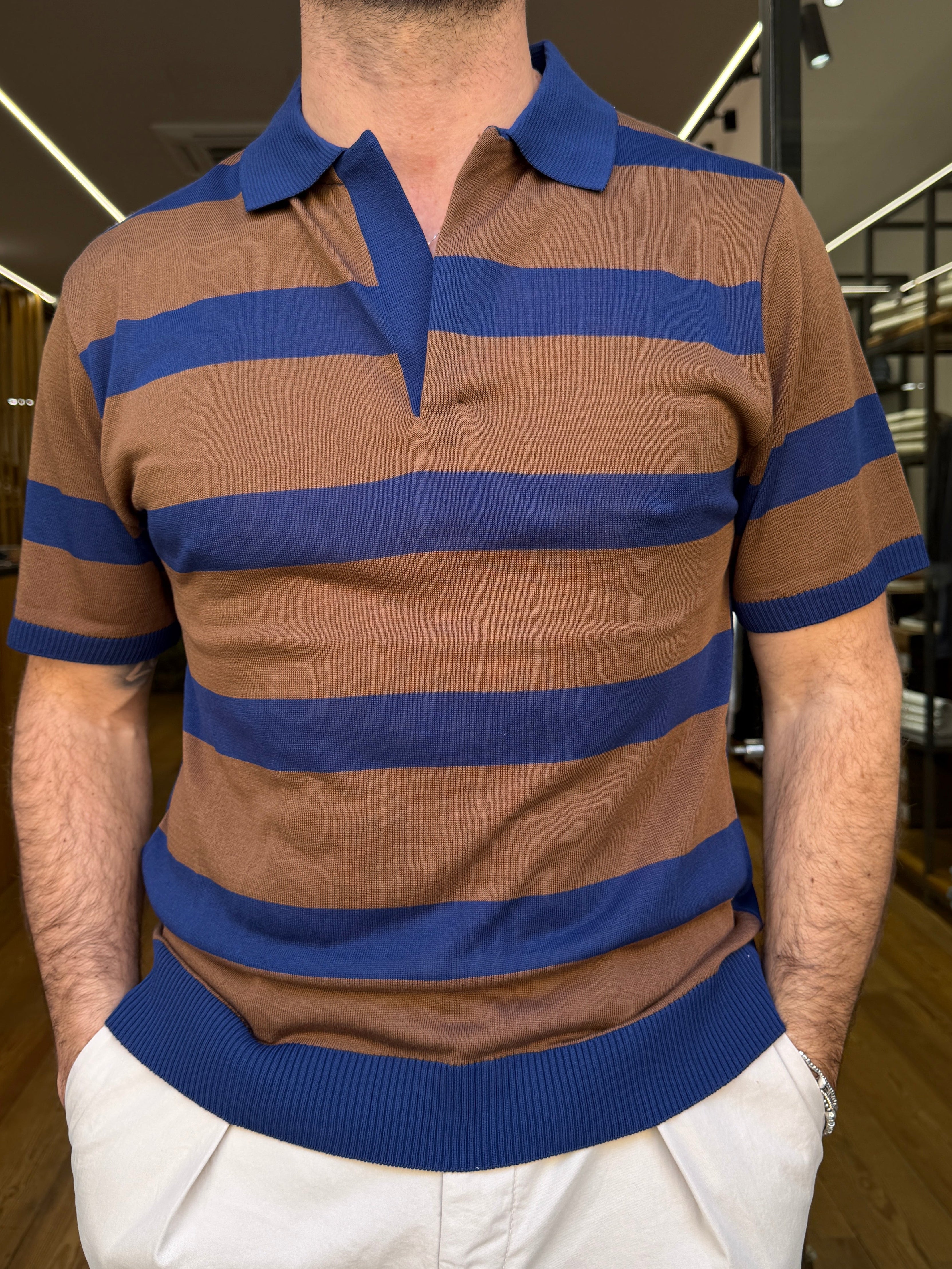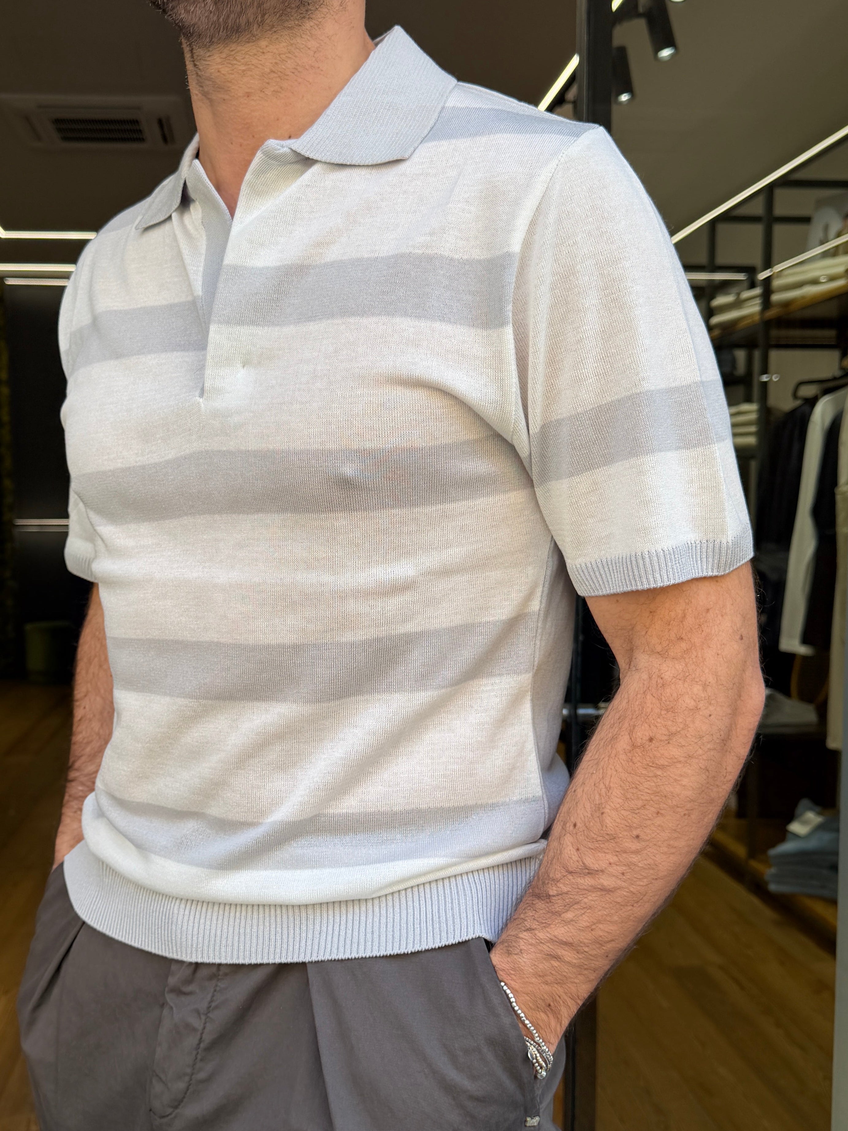 Minimal, moderna e pensata per il massimo comfort quotidiano. Questa polo a mezza manica è realizzata in un morbido blend di 50% cotone e 50% modal, che offre leggerezza, traspirabilità e una piacevole sensazione setosa sulla pelle. Il design senza bottoni dona un’estetica pulita e contemporanea, mentre le righe a contrasto aggiungono carattere e dinamismo al capo, rendendolo perfetto per chi cerca uno stile essenziale ma distintivo. Versatile e facile da abbinare, è ideale per la stagione più calda e per outfit casual curati.