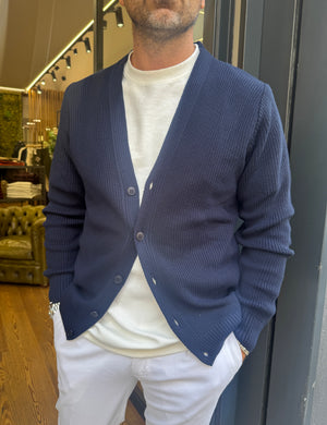 Questo cardigan da uomo diventerà il vostro inseparabile compagno per gli outfit quotidiani della stagione fredda grazie alla versatile tinta unita e alla morbida e calda composizione in lana . Il capo è proposto in una comoda vestibilità regular che non costringe i movimenti, ed è caratterizzato da un design classico con scollo a V, chiusura con bottoni e lavorazione a costine su polsini e fondo.