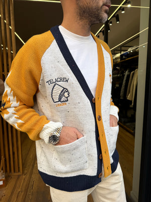 Cardigan con scollo a V e chiusura a bottoni che rievoca lo stile varsity americano, reinterpretato con gusto contemporaneo. Realizzato in misto lana , è caldo ma leggero, perfetto per il layering. Rifinito con tasche frontali e dettagli a contrasto