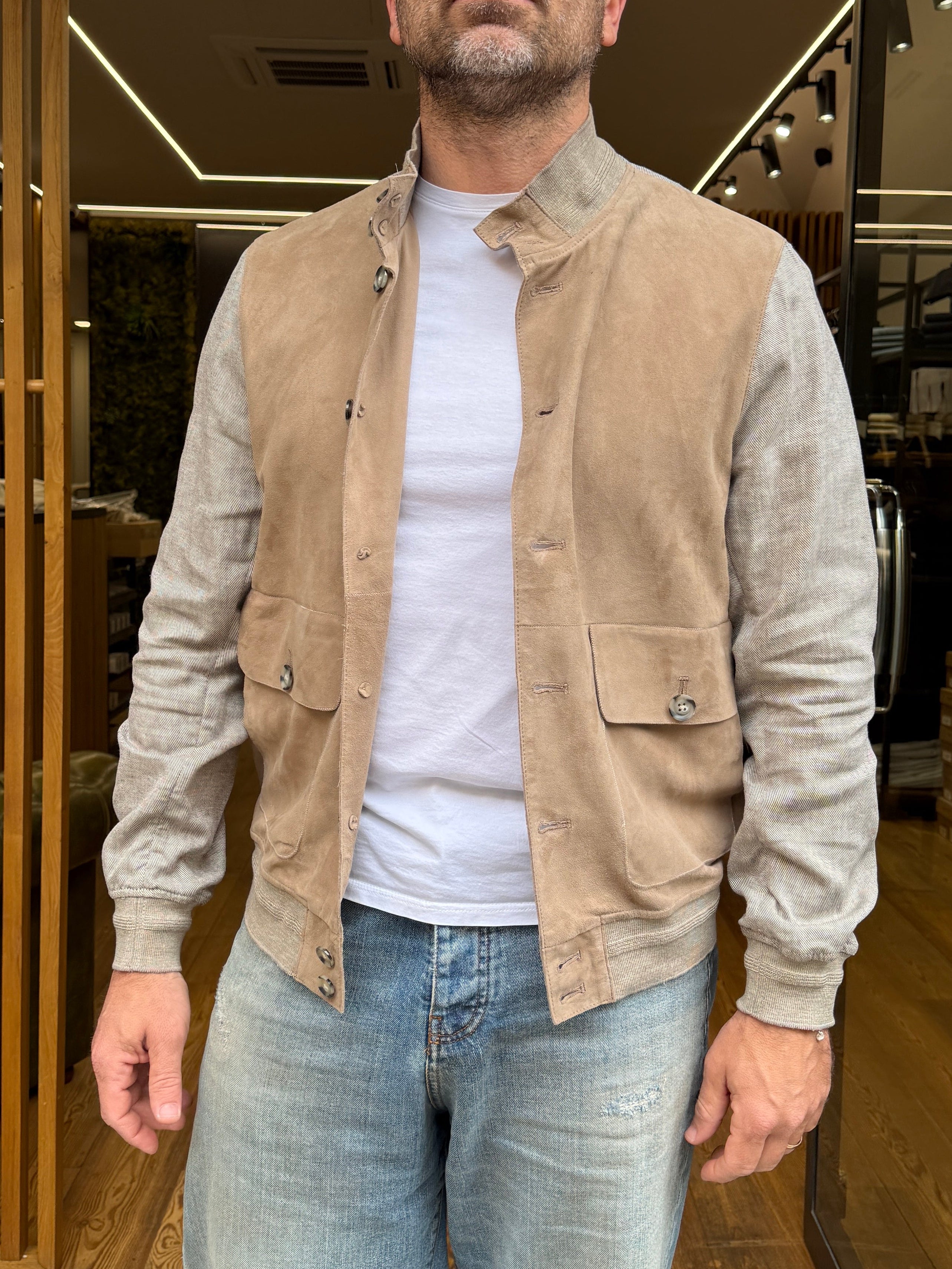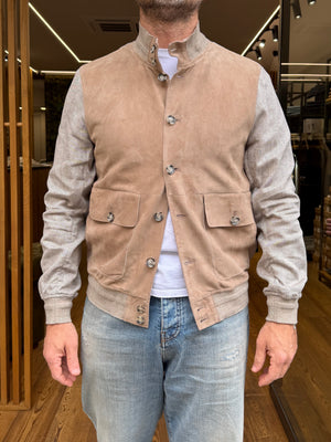 Giubbotto The Jack Leathers in pelle scamosciata Marrone. Maniche e pannello posteriore in twill di lino e cotone Beige. Collo alto in maglia a costine. Tasche frontali a doppia entrata. Polsi e fondo in maglia a costine. Chiusura con bottoni a vista. Interamente sfoderato e decostruito.