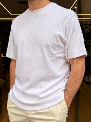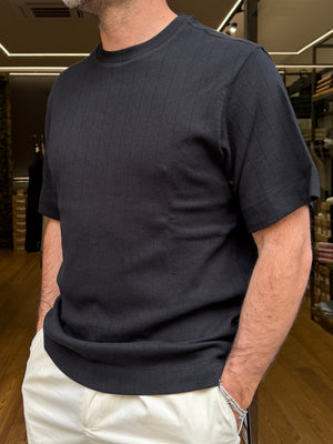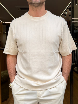 Maglietta a mezza manica in filo, dalla linea comoda e rilassata, pensata per garantire comfort e stile in ogni momento della giornata. Il design pulito è valorizzato da una lavorazione a micro-righe tono su tono, che dona profondità al capo mantenendo un’estetica essenziale e versatile.